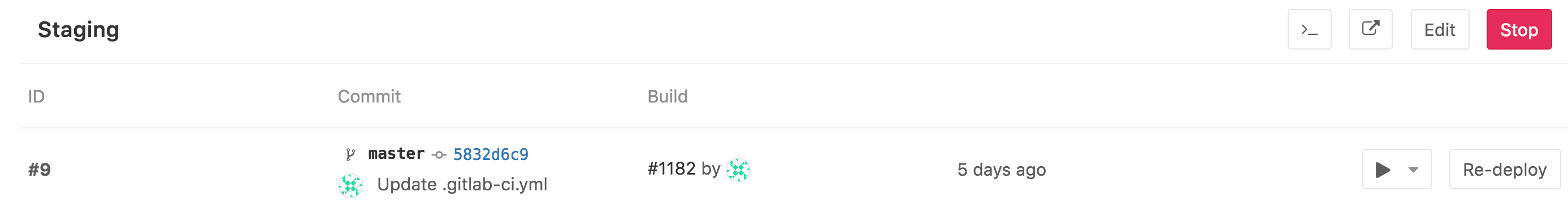environmentkeyword in.gitlab-ci.yml - A button that re-deploys the latest deployment, meaning it runs the job defined by the environment name for that specific commit