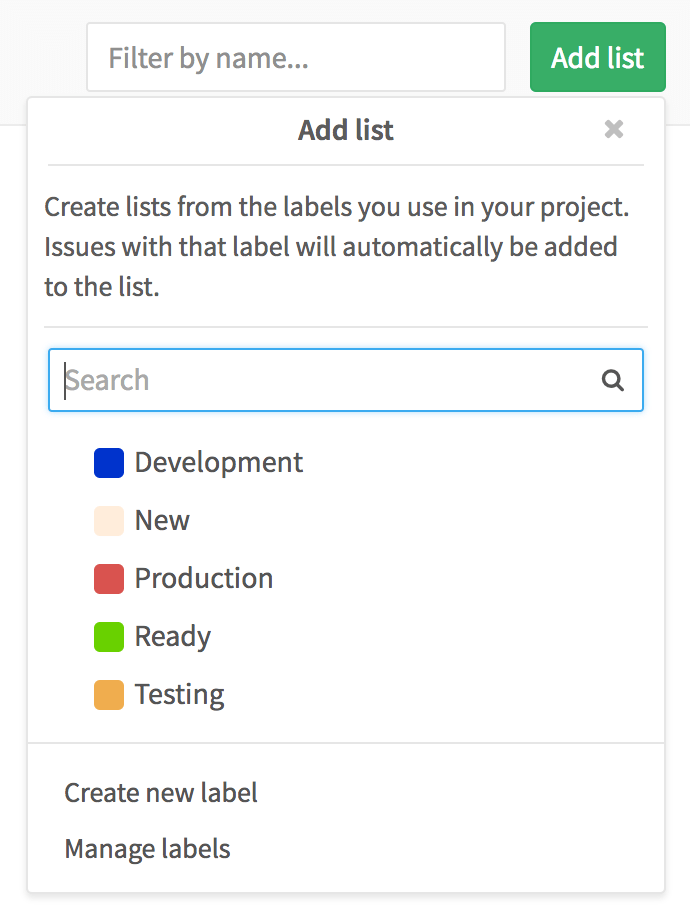 Create a new list by clicking on the Add list button at the upper right corner of the Issue Board.
