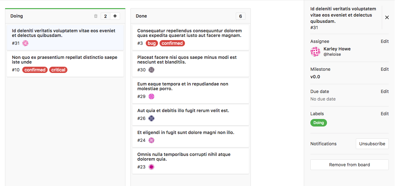 - Clicking on a label inside a card will quickly filter the entire Issue Board and show only the issues from all lists that have that label.